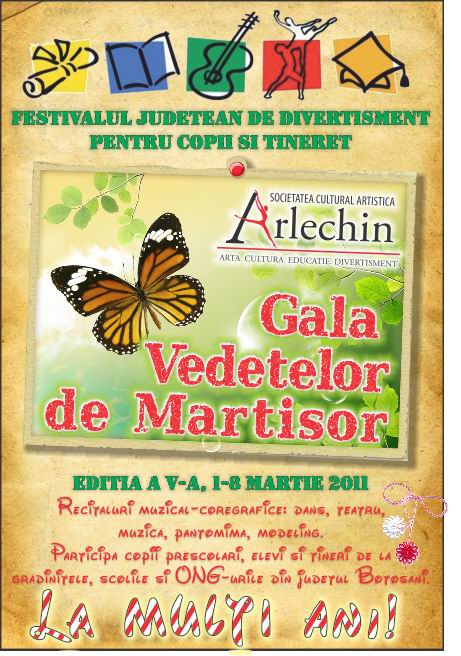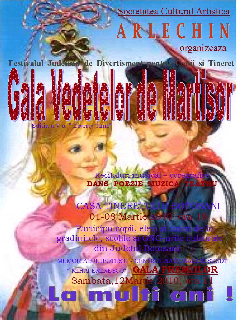 Societatea Cultural Artistică „ ARLECHIN ” Botoşani , vă invită, in data de, 8 martie 2011 , orele 18.00, în sala de festivităţi a Casei Tineretului Botoşani, la festivalul dedicat mărţişorului, frumusetii si sensibilitatii feminine ,, GALA VEDETELOR DE MĂRŢIŞOR ”.