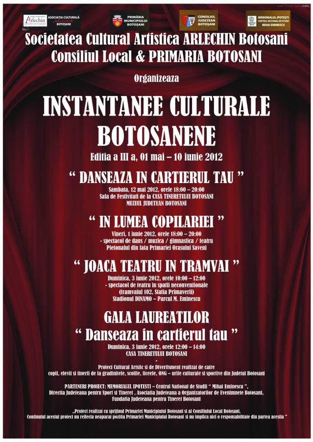 Asociatia Cultural-Artistica ARLECHIN Botosani, Primaria Municipiului Botosani, Consiliul Local Botosani, in colaborare cu Clubul Fotografilor Botosani, Asociatia „Dialog Deschis” si Directia Judeteana de Sport si Tineret Botosani, organizeaza in perioada 09 Mai – 10 iunie 2012 – Proiectul Cultural Artistic si de Divertisment „Instantanee Culturale Botosanene”, acesta se afla la aIII- a editie si se va desfasura sub forma unor intalniri a tinerilor cu aptitudini artistice in dans „Danseaza in cartierul tausi teatru „Joaca teatru in tarmvai”. Invitati la aceste intalniri vor fi si alti tineri cu aptitudini in: muzica, fotografie, pantomima si modelling.  Activitatile cuprinse in proiect, vor avea loc, in spatii neconventionale din municipiul Botosani, cum ar fi: sali de sport a institutiilor partenere, stadioane, statii de tramvai, tramvaie aflate in miscare, strazi si locuri publice. Astfel, iubitorii de dans, muzica, teatru, fotografie, pantomima si modelling vor avea ocazia sa petreaca clipe de relaxare, iar strazile si tramvaile constituindu-se totodata prin atmosfera care va fi creata , intr-un veritabil punct de intalnire al prietenilor artei si culturii botosanene.