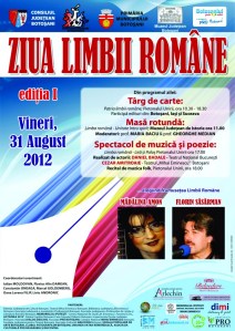 Ziua Limbii Romane a fost celebrata pentru prima data la Botosani, Vineri, 31 august 2012, organizatorii acestui important eveniment au fost Asociaţia Judeţeană a Organizatorilor de Evenimente, Muzeul de Istorie, Primăria şi Consiliul Judeţean Botosani. Evenimentul s-a desfăşurat ieri, iar programul, menit să elogieze frumuseţea Limbii Române, a debutat la ora 10.00, cu un târg de carte desfăşurat pe Pietonalul Unirii, unde au participat edituri din judeţele Botoşani, Iaşi şi Suceava. Acesta a continuat cu masa rotundă „Limba română – Unitate întru spirit”, la ora 11.00, la Muzeul Judeţean de Istorie, moderată de prof. Maria Baciu şi istoricul Gheorghe Median. La ora 17.00, tot pe Pietonalul Unirii, a avut loc spectacolul de muzică şi poezie „Limba română – Liră şi Paloş”, realizat de actorii Daniel Badale de la Teatrul Naţional Bucureşti şi Cezar Amitroaie de la Teatrul „Mihai Eminescu” Botoşani. Evenimentele dedicate Zilei Limbii Române s-au încheiat la Botoşani cu un recital de muzică folk, pe acelaşi pietonal, la ora 18.00, interpreţi fiind Mădălina Amon şi Florin Săsărman. Iniţiatorii şi coordonatorii evenimentului sunt Iulian Moldovan, Flavius Alin Damean, Constantin Oneaga şi Ion Ciobanu ,, este un succes faptul ca am reusit la Botosani, sa marcam pentru prima data in Romania, Ziua Limbii Romane, la aceasta sarbatoare nationala au fost prezenti, poeti, scriitori, istorici, profesori si membri ai grupurilor de initiativa din cadrul Coalitiei Civice ACTIUNEA 2012, care sustin unirea Republicii Moldova cu Romania si militeaza pentru realizarea obiectivului generatiilor trecute, prezente si viitoare de regasire a romanilor de pe cele doua maluri ale Prutului in cadrul aceluiasi stat’’ a declarat Flavius alin Damean, presedintele Asociatiei Judetene a Organizatorilor de Evenimente Botosani. Un aport important in realizarea acestei manifestari la avut , Ministerul Culturii, Directia Judeteana pentru Cultura Botosani, Teatrul Mihai Eminescu Botoșani,, Biblioteca Județeană „M. Eminescu” Botoșani, Asociația Județeană a Jurnaliștilor Profesioniști Botoșani, Forumul Civic „ACȚIUNEA 2012”, Asociația Județeană a Profesorilor de Limba și Literatutra Română Botoșani, MEMORIALUL IPOTEȘTI – Centrul Național de Studii „M. Eminescu”, Palatul Copiilor Botoșani, Casa Corpului Didactic Botoșani, Inspectoratul Școlar Județean Botoșani, Asociația DIALOG DESCHIS, Asociația Pro Botosani, Colegiul National MIHAI EMINESCU Botosani, Fundația Județeană pentru Tineret Botoșani,, Asociatia Culturala ARLECHIN Botosani, Clubul Fotografilor Botosani,Uniunea Vatra Românească,AsociaȚIa Culturală Pro Basarabia si Bucovina