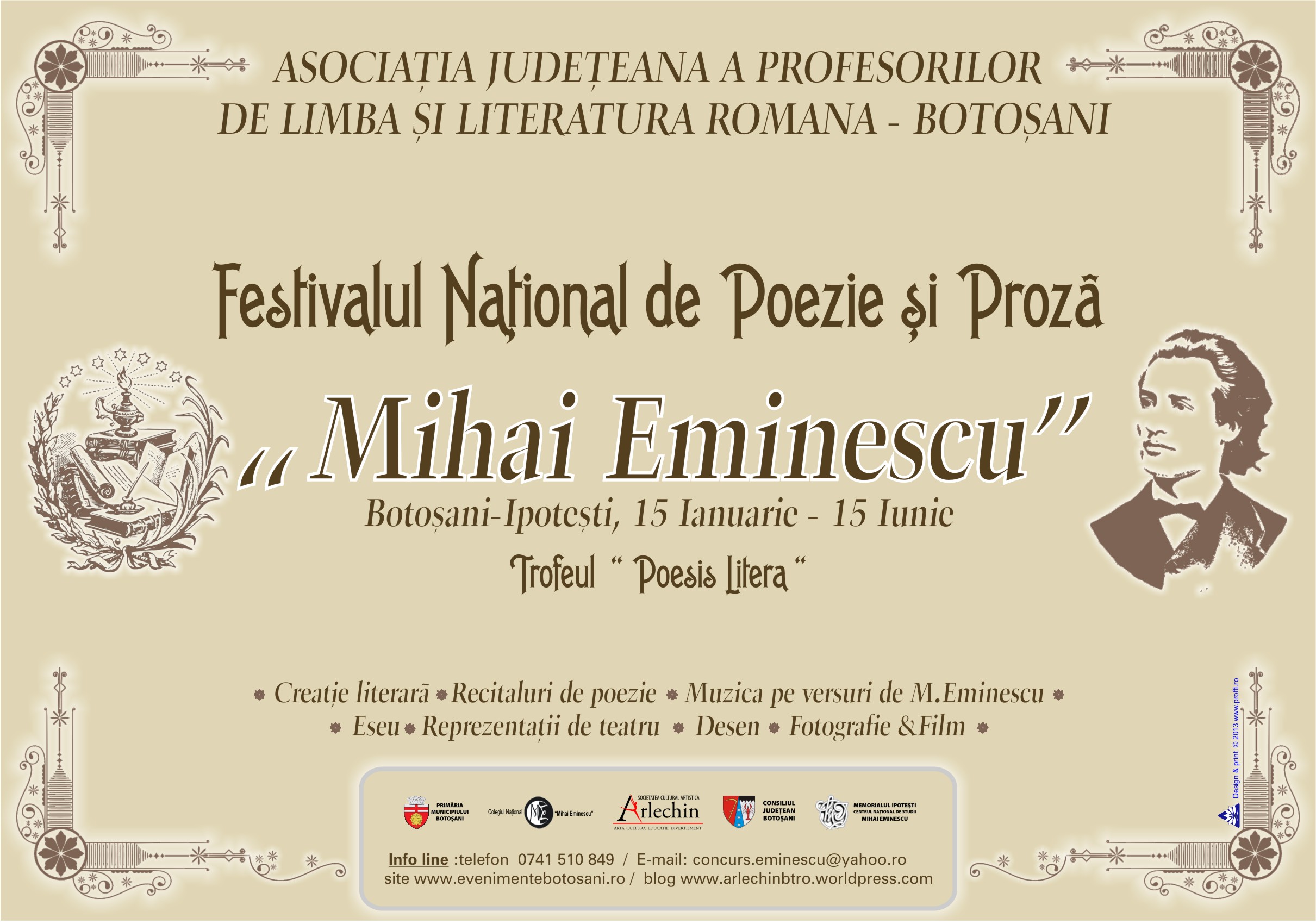 – Prezentarea şi lansarea Festivalului Naţional de Poezie şi Proză „Mihai Eminescu”, ediţia a III a – Poesis Litera, unde sunt invitate să participe personalităţi ale vieţii culturale şi artistice, iubitori de teatru, muzică, fotografie, pictură, istorie, literatură şi poezie: Badale Daniel, Manolache Ciprian, Cristina Chiriac, Muraru Crina, Damea Diana, Axinciuc Cristina, Epurianu Daniela, Săvescu Tamara, Hăilă Irina, Timingeriu Mihaela, Zamfirescu Violeta, Ringhilescu Mariana, Ticalo Mihaela, Artim Mihaela, Căruntu Gabriela, Stefănescu Mirela, Maria Oniciuc, Cristina Bălăucă, Ludvic Schibinschi, Mirela Soprovici, Ciprian Cazacu Hoffman, Marius Petrescu, Cornelus Drescanu.