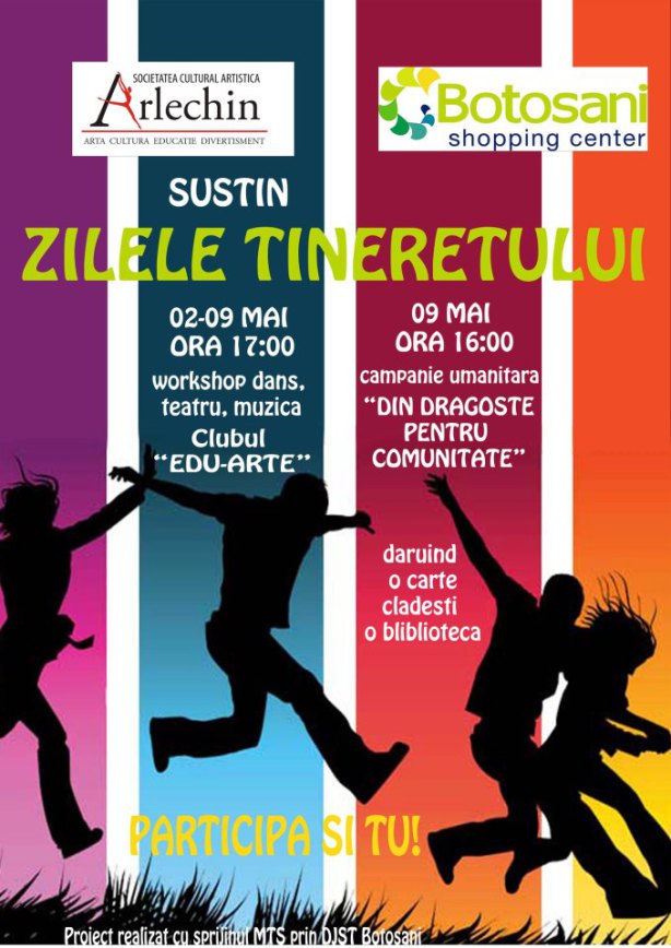 Tinerii de la Asociaţia Culturală Arlechin Botoşani organizează Sâmbătă, 2 mai 2015 la Casa Tineretului Botoşani , între orele 10.00 – 16.00 o serie de workshop-uri de teatru, dans şi manifestări cultural -artistice pentru a sărbători Ziua Naţională a Tineretului.