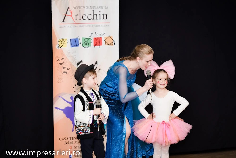 După două ore de bună dispoziție în compania prietenilor de la Teatrul de Păpuși, copiii au umplut sala de spectacole să urmărească programul artistic pregătit de alți copii, membrii Societății Cultural-Artistice Arlechin. Uniți pe scena recent inaugurată, arlechinii au ridicat sala în picioare. Părinți și copii spectatori au aplaudat, ovaționat și dansat, antrenați de prestațiile vedetelor.