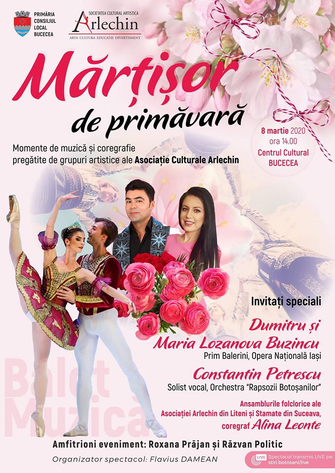 În sala de spectacol de la Centrul Cultural Bucecea, duminică, 8 martie 2020, ora 14.00, tinerii și micuţii arlechini vor dansa, cânta şi împărţi zâmbete mamelor lor, doamnelor și publicului spectator alături de invitații speciali, balerinii Dumitru și Maria Lozanova Buzincu, prim soliști de la Opera Națională Iași, Constantin Petrescu, solist Rapsozii Botoșanilor. Pe scenă vor evolua ansamblurile de folcor ale Asociației Arlechin din Suceava, coregraf Alina Leonte, ansamblurile de balet ,,Arlechin”, ,,Princess”, ,,Baleriness”, coregraf Celina Dumitru, grupul artistic ”Arlechin” de la Asociația ”Arlechin”, pregătire muzicală, profesor Andreea Suceveanu, grupul artistic ”Crenguța de Busuioc” de la Asociația ”Arlechin”, pregătire muzicală Carmen Cornaci, trupa de dans ,,Funny Dance”, coordonatori Roxana Bidalac, Simona Acsente, Flavius Damean, grupul artistic ,,Românașii”, profesor Loredana Călin, formațiile de dans ,, Little Stars” și ,,Fashion Dance”, coregrafi, Flavius Damean și Lorena Alupoaie de la Centrul Cultural Bucecea. Toate momentele muzical-coregrafice vor fi imortalizate de aparatele foto ale părinţilor, dar mai ales de fotografii acreditaţi Marius Boatcă și Ionuț Iosub. Evenimentul va fi transmis live pe prtalul http://www.stiribotosani.ro/live. Moderatori și amfitrioni eveniment Roxana Prăjan și Răzvan Politic.