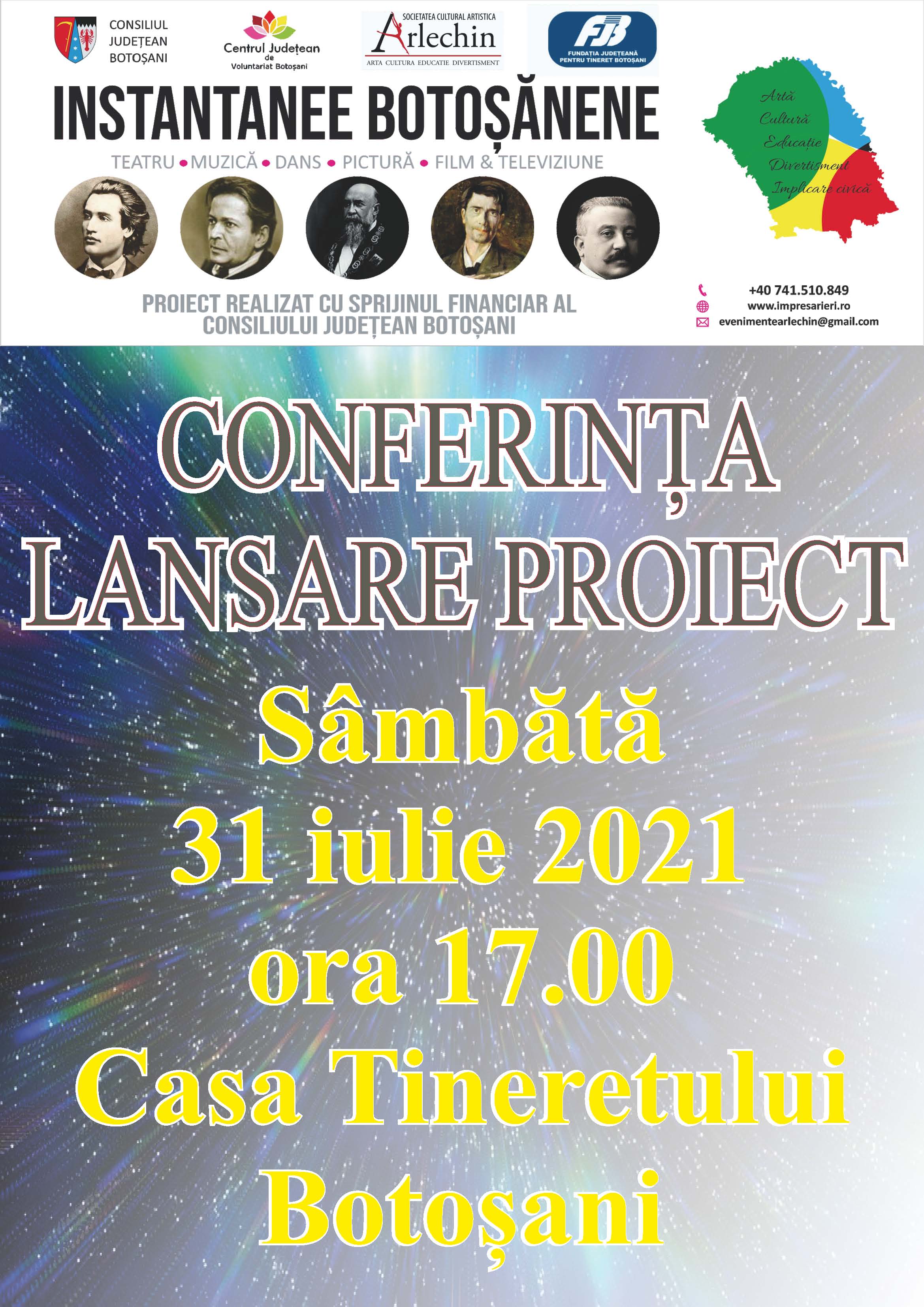 Asociaţia Cultural Artistică “Arlechin” Botoșani vă invită în data de 31 iulie 2021, orele 17.00, la sediul Fundației Județene pentru Tineret Botoșani din incinta Casei de Cultură a Tineretului Botoșani să participaţi la Conferința de lansare a proiectului ”Instantanee Botoșănene ”.