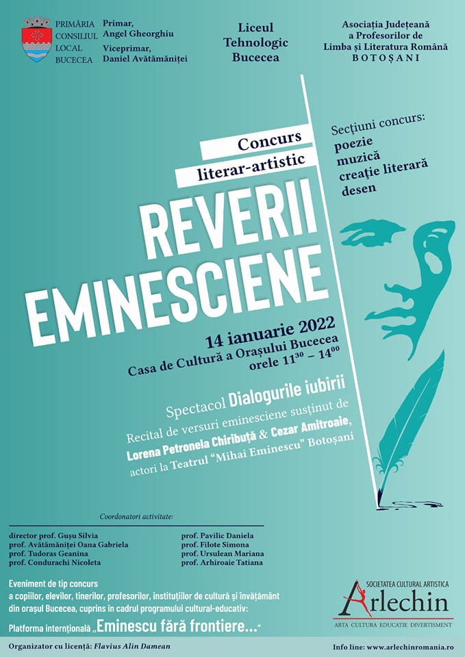 Concursul literar-artistic „Reverii eminesciene” inițiat și organizat de către Liceul tehnologic Bucecea în data de 14 ianuarie, la Casa de cultură cu sprijinul Primăriei și Consiliului local a orașului Bucecea este cuprins în calendarul de activități și evenimente a proiectului – Festivalul Național de poezie și proză ,,Mihai Eminescu” realizat anual de către de către Asociația județeană a profesorilor de limba și literatura română Botoșani, Colegiul Național ,,Mihai Eminescu” Botoșani, Asociația culturală ,,Arlechin” și Fundația Județeană pentru Tineret Botoșani, având ca scop principal sustinerea, descoperirea și promovarea elevilor și tinerilor cu aptitudini în domeniul literar-artistic și dorința acestora de a creea și realiza lucrări, materiale și momente artistice, având ca izvor de inspirație opera poetului nostru național Mihai Eminescu: poezie, proză scurtă, eseu, critică & creaţie literară, teatru, desen, fotografie şi film.