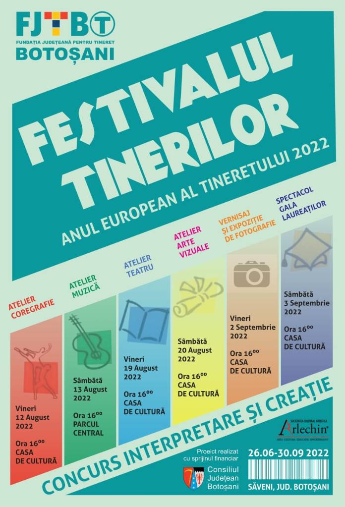 Fundaţia Judeţeană pentru Tineret Botoşani vă invită în perioada 12 august – 03 septembrie 2022 să participați la activitățile proiectul ,,Festivalul Tinerilor”, după cum urmează: