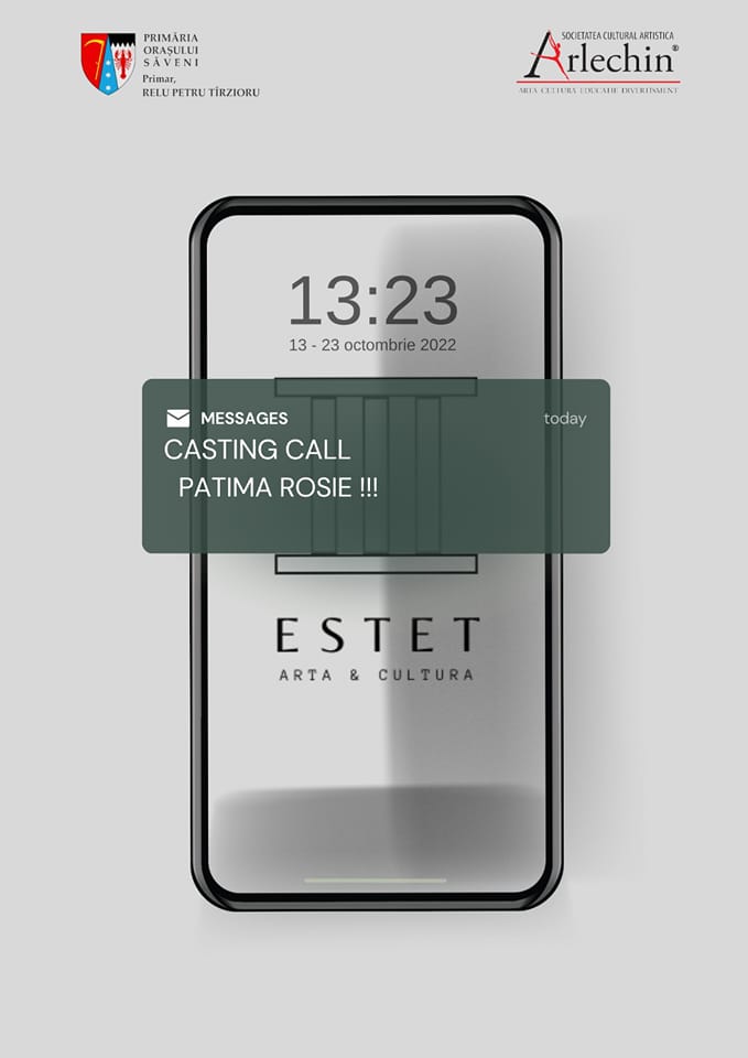 Se caută 2 băieți și o fată (actori sau studenți ai facultăților de profil din România sau Republica Moldova) în vederea punerii în scenă a spectacolului ,,Patima roșie” în regia lui Robert Kocsis, pentru rolurile Castriș, Rudy și Crina. Evenimentul face parte din proiectul ,,SMS – Seri Magice Săveni” susținut de domnul Relu Petru Tîrzioru, primar al Orașului Săveni , grupul de inițiativă ,,Estet” și Asociația Culturală ,,Arlechin” cu desfășurare la Centrul Cultural Săveni, în perioada 05 – 16 decembrie 2022.