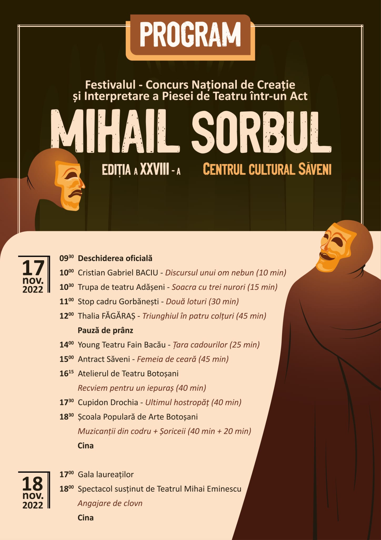 Vezi programul Festivalului -Concurs de Creație și Interpretare a Piesei de Teatru Într-un Act „Mihail Sorbul”, ediția a XXVIII-a, Săveni, 17-18 noiembrie 2022!