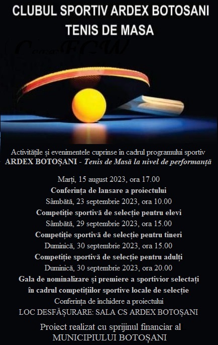 Clubul Sportiv Ardex Botoșani realizează în perioada 15 august -15 octombrie 2023 , activitățile principale ale proiectului ,, Ardex Botoșani – Tenis de masă la nivel de performanță”. Proiectul beneficiază de  sprijinul financiar al Municipiului Botoșani. Programul pe zile al activităților, evenimentelor și competițiilor realizate în cadrul proiectului este următorul: