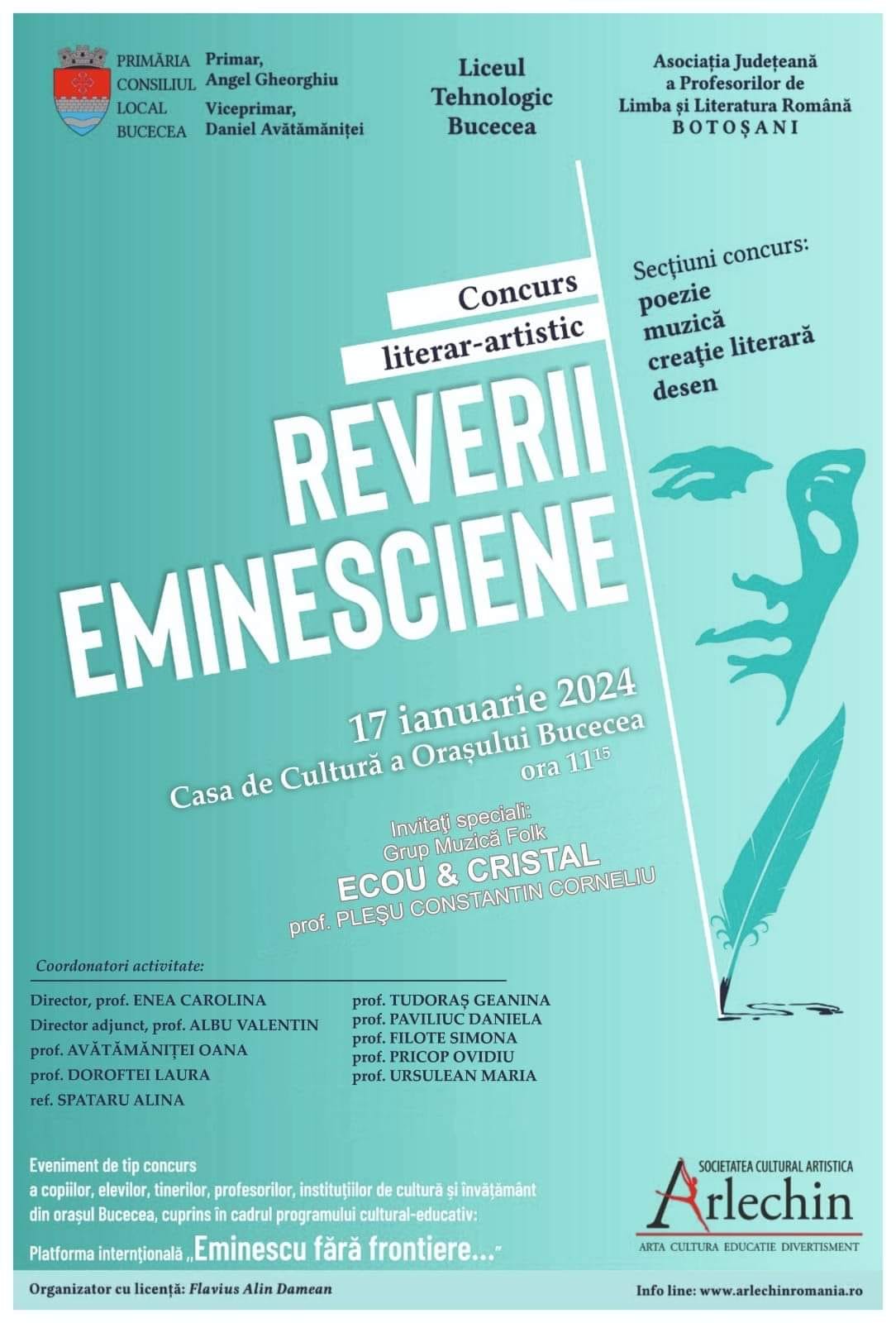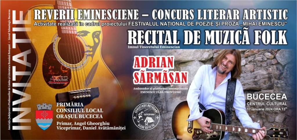 Concursul literar-artistic „Reverii eminesciene”, aflat anul acesta la a treia ediție, este organizat în perioada 15-17 ianuarie 2024 de către Liceul tehnologic Bucecea, cu sprijinul Primăriei și Consiliului local a orașului Bucecea, reprezentată prin Angel Gheorghiu, primar al orașului Bucecea și Daniel Avătămăniței, viceprimar al orașului Bucecea. Spectacolul și gala laureaților are loc la Centrul Cultural, în data de 17 ianuarie a.c, începând cu ora 11.00, în recital fiind invitat marele folkist Adrian Sărmășan, cantautor, poet și artistul muzicii folk al anului 2017, desemnat de Radio Romania Actualitati in cadrul Galei Premiilor Radio , Cel mai bun folkist al anului 2017 – Fata din povesti, castigator al Discului de Aur  oferit de EUROMUSIC . Debuteaza in Cenaclul Flacara la 17 ani , are 7 albume de autor si 3 volume de versuri si proza. Adrian Sarmasan are foarte multe cântece premiate în Top Romanesc și sustine recitaluri în tara și în strainatate , canta si in limba engleza piese proprii . Iubitor de frumos si pasionat de arte . Deviza sa este ,, sunt un artist fara astampar atat timp cat ma vor sustine astrele si Dumnezeu. Cânt pentru sufletul meu și al celor ce se regăsesc în muzica mea”.