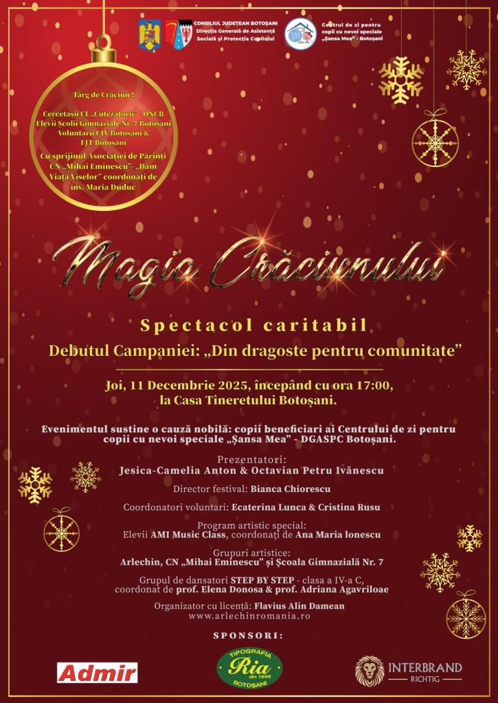 În seara de joi, 11 decembrie 2025, Casa Tineretului Botoșani va deveni din nou spațiul în care emoția, generozitatea și bucuria sărbătorilor se vor întâlni sub semnul artei și al solidarității. Evenimentul, cuprins în calendarul de activități al proiectului Festivalul „Povești de Iarnă”, aflat în acest an la ediția a XX-a, va avea o dublă semnificație: pe de o parte, publicul va fi invitat să se bucure de spectacolul caritabil „Magia Crăciunului”, iar pe de altă parte, va debuta oficial Campania umanitară „Din dragoste pentru comunitate”, un amplu demers de solidaritate dedicat sprijinirii copiilor de la Centrul de zi „Șansa Mea”, din subordinea Direcției Generale de Asistență Socială și Protecția Copilului Botoșani.