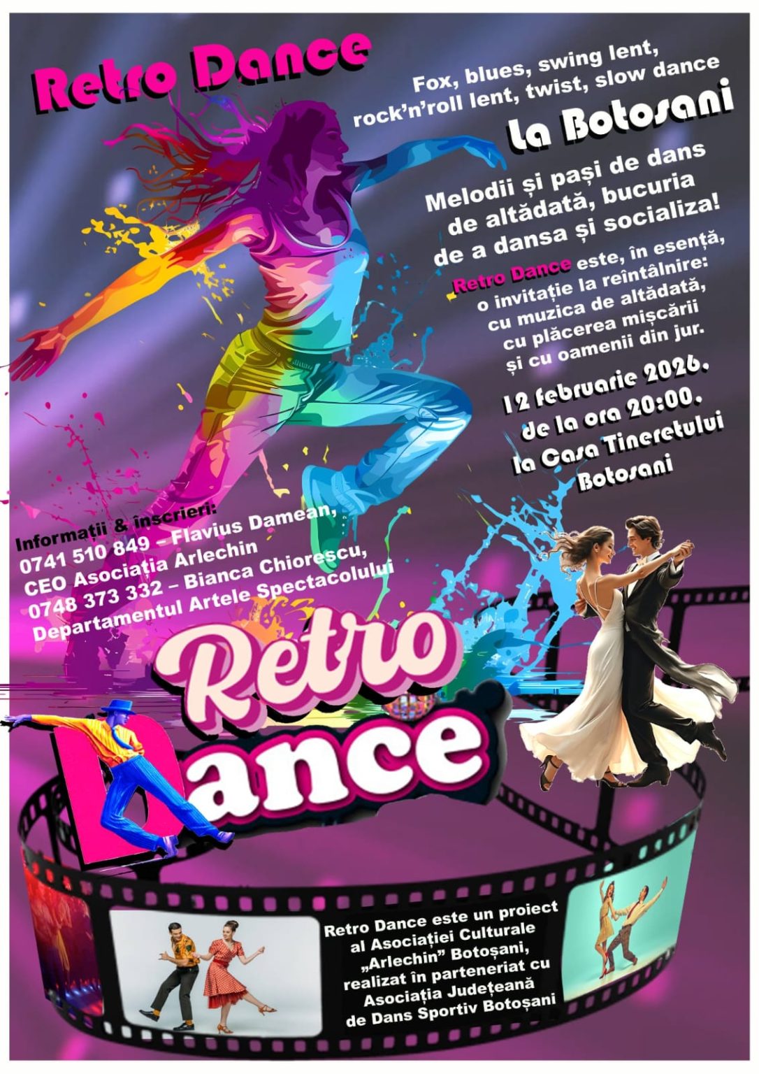 Informații & înscrieri: 0741 510 849 – Flavius Damean, director executive / 0748 373 332 – Bianca Chiorescu, coordonator Departamentul Artele Spectacolului. / email: cursuriarlechin@gmail.com / dansbotosani@gmail.com / site: www.arlechinromania.ro / www.dansbotosani.ro