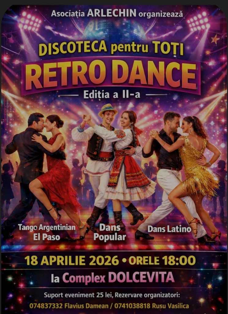 Prima ediție a „Discotecii pentru Toți” a fost una dintre acele experiențe care nu s-au încheiat odată cu ultima melodie, ci au continuat în amintiri, în zâmbete și în dorința sinceră de a repeta acel moment. Din această energie se naște „Discoteca pentru Toți – Retro Dance, Ediția a II-a”, organizată de Asociația Societatea Cultural-Artistică „Arlechin” Botoșani, pe 18 aprilie 2026, de la ora 18:00, la Complex Dolce Vita.