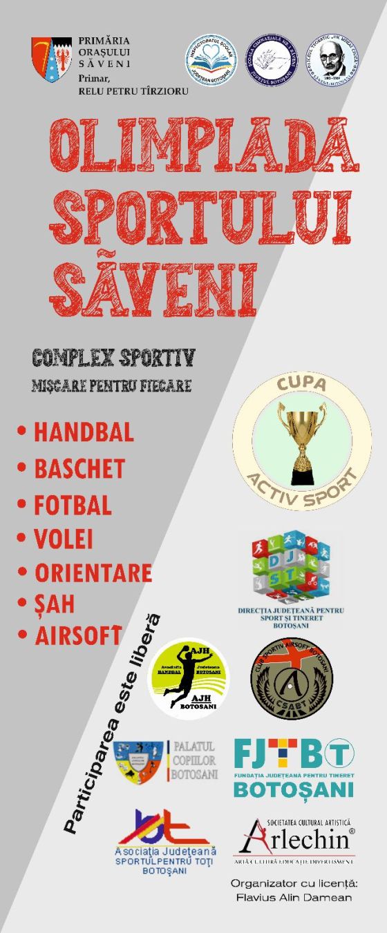 Olimpiada Sportului Săveni – Trofeul ,,Activ Sport”! Vezi unde și când au loc competițiile sportive ale ediției de primăvară: handbal, gimnastică, baschet, volei, fotbal, șah, orientare sportivă, airsoft, atletism și tenis de masă!