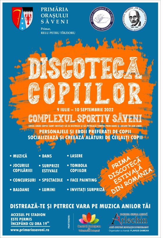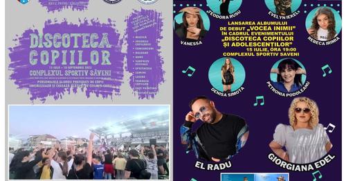 Un nou sezon estival începe la Săveni cu discoteca copiilor și adolescenților! Vino și participă alături de prietenii tăi la petreceri tematice, spectacole, concursuri, tombola copiilor, ateliere de muzică, dans, face painting și alte surprize estivale, alături de invitați speciali, personaje şi eroii preferaţi de copii!
